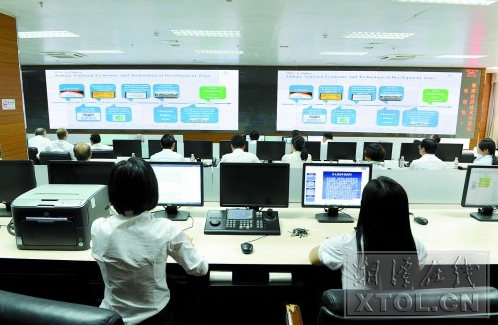走進湘潭經(jīng)開區(qū)綜合服務(wù)中心,首先映入眼簾的是一面墻大小的LED顯示屏。工作人員告訴我們,這塊大屏幕由多個城區(qū)電子監(jiān)控視頻組成。透過它,轄區(qū)內(nèi)每個角落的點點滴滴都能盡收眼底。