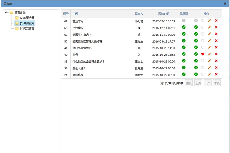 4. 相關(guān)部門的管理員對(duì)留言進(jìn)行審核、設(shè)為常見問題、回復(fù)、刪除等操作