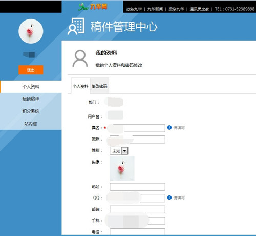 稿件管理中心根據(jù)九華通訊員投稿、審稿管理需求設(shè)立了個(gè)人資料、我的稿件、積分系統(tǒng)及站內(nèi)信四個(gè)欄目,完美解決了稿件繁冗、復(fù)雜難以管理的問題,其具體的實(shí)用性如下: