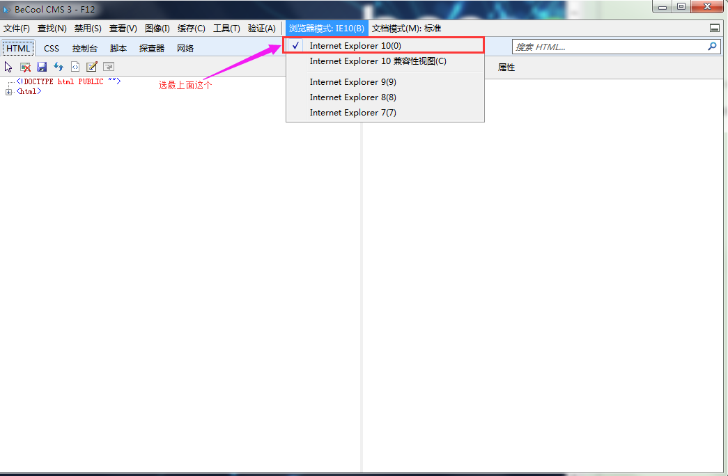 2. 看到瀏覽器模式和文檔模式,根據(jù)IE版本選擇對應的模式。如IE10,瀏覽器模式默認為IE10,文檔模式會默認是標準模式。注意不要選擇有“兼容性視圖”的瀏覽器模式,文檔模式會隨之變?yōu)?/span>IE7或更低版本。    再將文檔模式設置為標準默認模式。