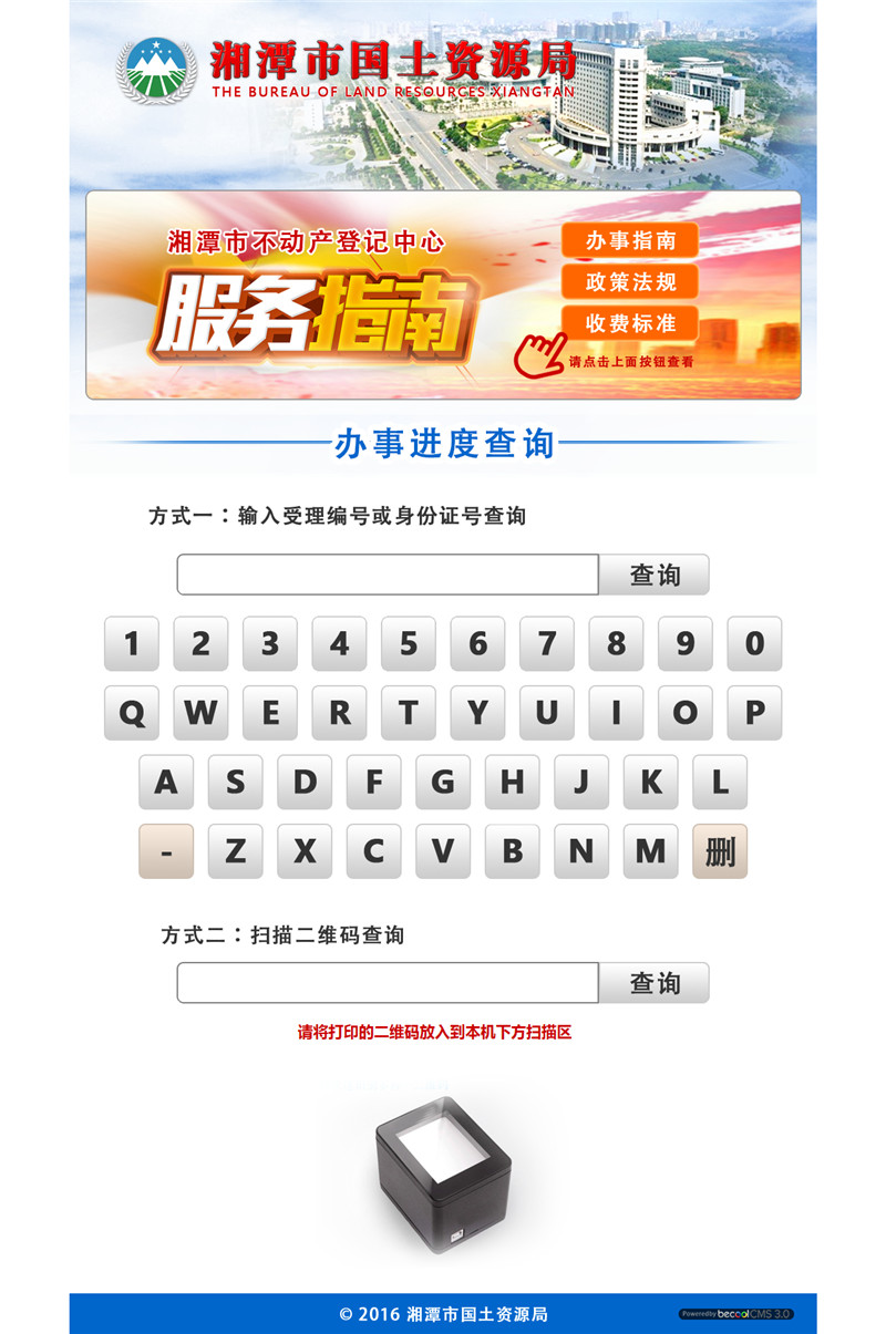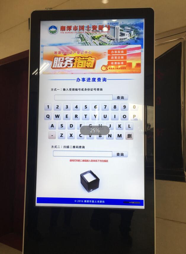 本項(xiàng)目為湘潭市國土資源局辦事大廳,用于群眾查詢辦事進(jìn)度的觸屏機(jī)上。項(xiàng)目含政策法規(guī)資訊和辦事進(jìn)度查詢兩塊,群眾只需在觸屏界面上輸入受理編號(hào)或身份證號(hào),即能查詢到辦事的進(jìn)度。此項(xiàng)目分管或下級(jí)局屬單位可軟硬件直接成套購買后使用。